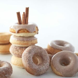 Hornee de 7 a 9 minutos o hasta que la parte superior de las rosquillas salga hacia atrás cuando se toque. Deje enfriar 5 minutos antes de retirar a la rejilla de enfriamiento para que se enfríe por completo. Cubra con cualquiera de los siguientes: